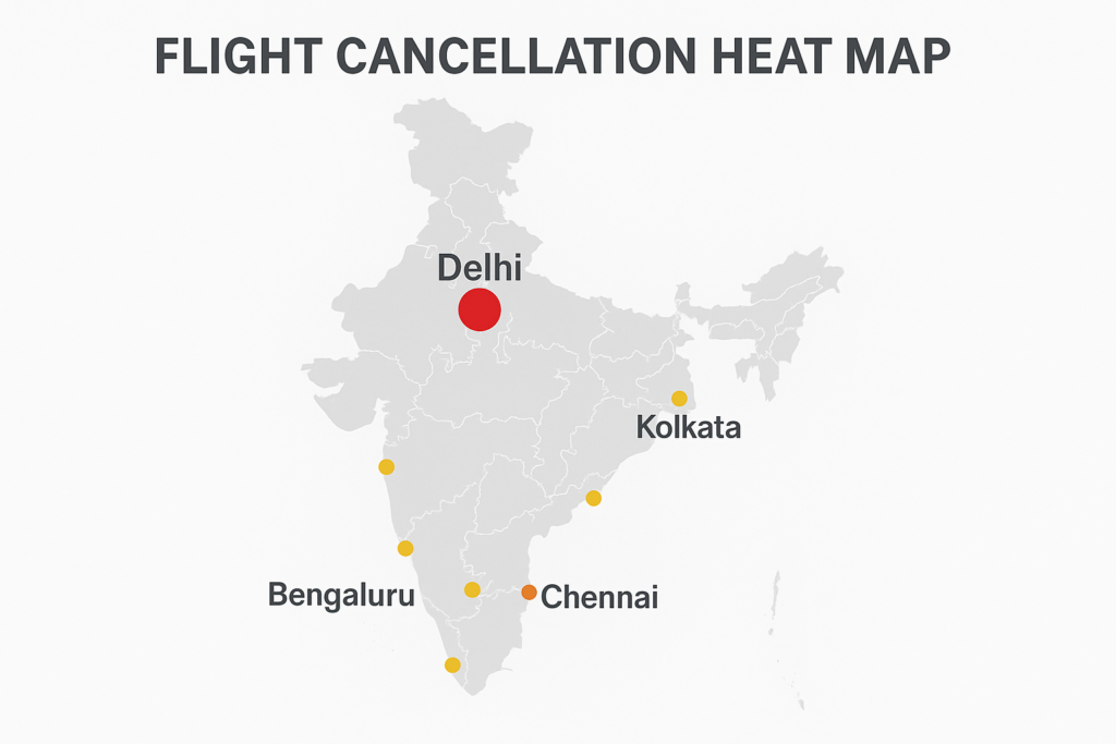 • Some routes such as Delhi to Mumbai, Delhi to Bengaluru and Delhi to Pune saw near-total disruption, with multiple back-to-back cancellations.